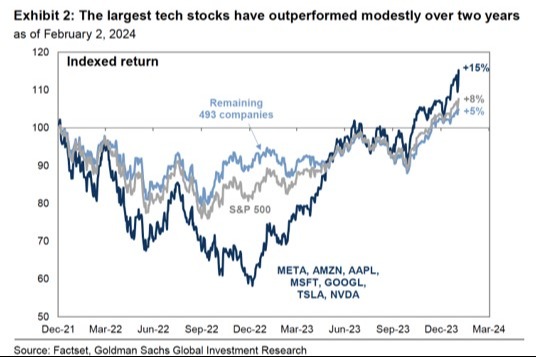The “Magnificent 7” stocks have been all over the news for good reason. In 2023, Apple, Nvidia, Microsoft, Tesla, Amazon, Alphabet (Google), and Meta (Facebook) outperformed the other 493 stocks in the S&P 500 by 62% (76% vs 14%)1.