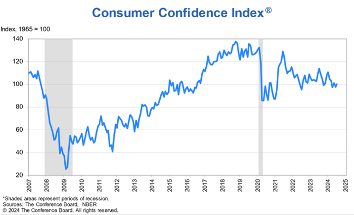 The first is consumer confidence. The more confident we are, the more willing we are to spend. Confidence increased in July, but not enough to break free of the narrow range that has prevailed over the past two years. Consumers still appear concerned about rising prices, high interest rates, and possibly even the Presidential election.