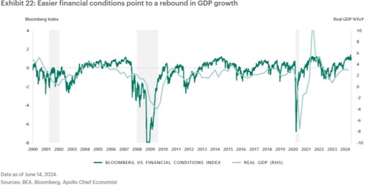 The chart below shows that financial conditions have eased this year (rising green line on the right). Meaning, access to capital and the affordability of that capital have improved. Mortgage rates remain high relative to the last decade, but if the Fed cuts interest rates next month, expect these conditions to ease further and promote even more spending.