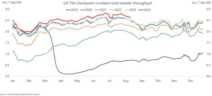 For example, the chart below shows that a record number of travelers (red line) have passed through TSA checkpoints this year. Air travel is one of the best indicators of discretionary spending and willingness to spend because we typically travel for fun and when we feel good about our financial situation. Furthermore, buying a plane ticket usually leads to spending even more