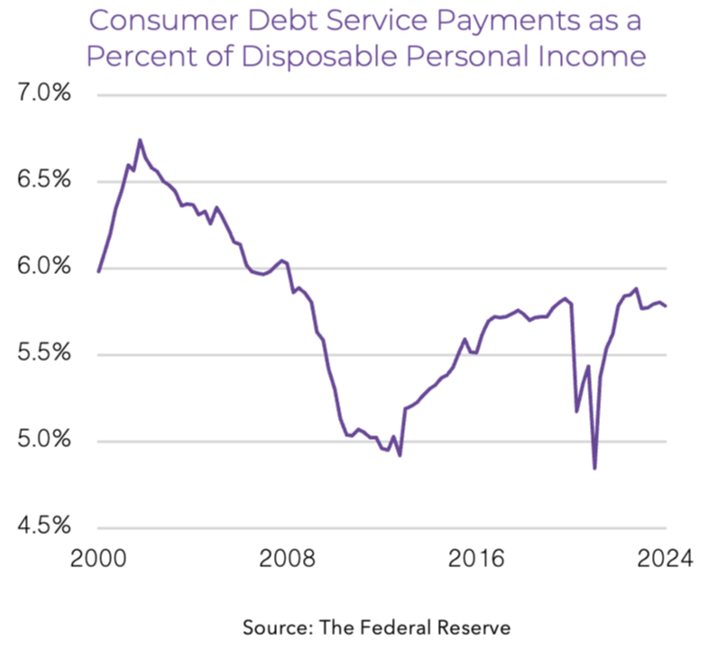 The second factor is debt affordability. The chart below shows that the disposable income going toward interest payments rose from 2022-2023 but was still well below the 2000s. This trend reversed late last year and has stabilized for now.