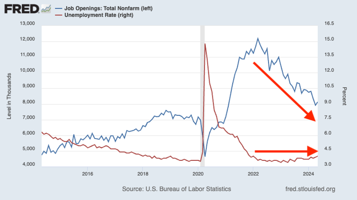 The second factor is the state of the job market. The more confident we feel about our job prospects, the more we spend. The chart below shows that job openings have fallen (blue line), but the unemployment rate (red line) has barely moved.