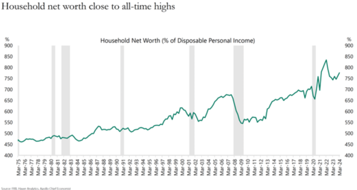 The chart below aggregates the impact of these three factors. Household net worth is almost eight times higher than disposable income. Simply put, spending capacity (ability) is near an all-time high.