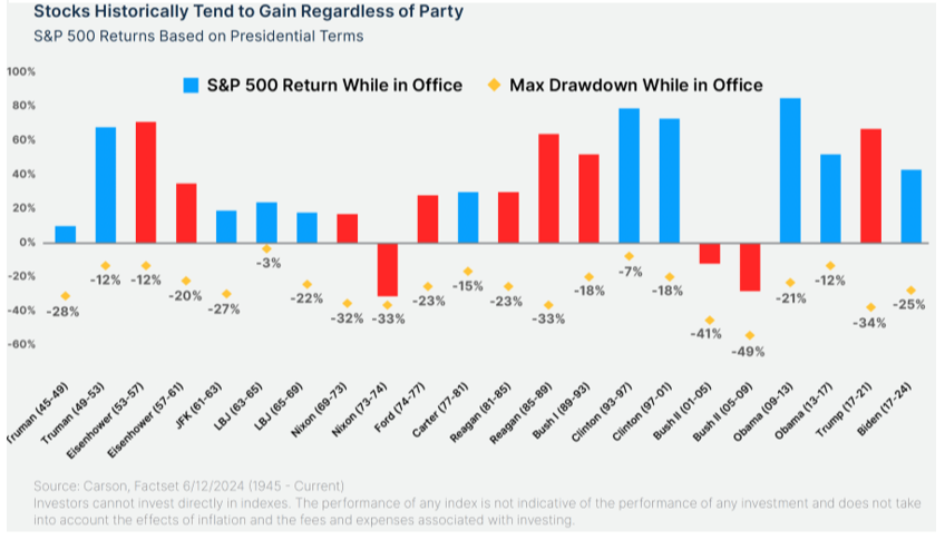 Beating a dead horse even harder, the two charts below show that (1) stocks tend to gain regardless of which party is in the White House, and (2) every president experienced a drawdown at some point during their administration2,3. It’s as if election years are no different than non-election years.