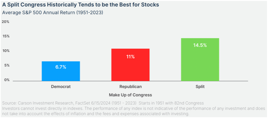 Divided governments diminish presidential powers because passing policy becomes harder. Anything too radical from either side tends to get shot down, so less gets done. Fewer things happening in D.C. fuels less uncertainty about the future, which is a tailwind for markets because investors hate uncertainty. Even if existing policies are less favorable, when the rules aren’t changing, investors know what to expect.