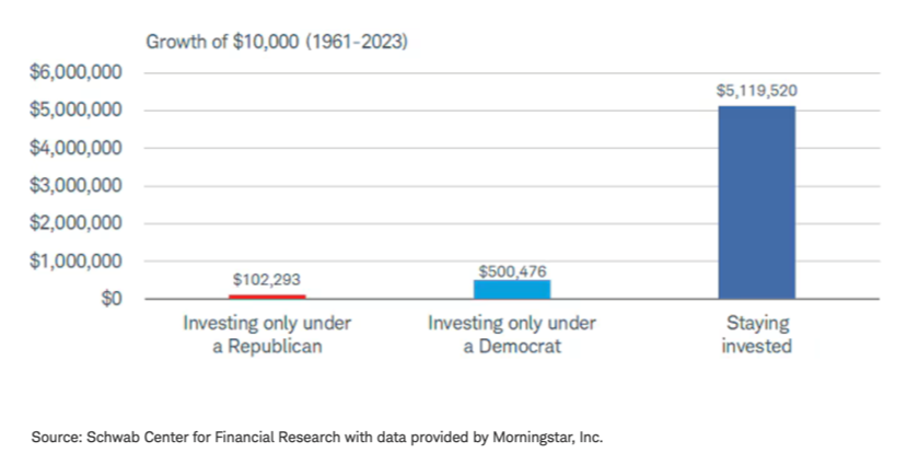 However, those data tell us nothing about what happens after the winner moves into the White House. The chart below shows that investing only when a Republican was in office grew a $10,000 investment in 1961 to more than $102,000 by 2023. Invest only when a Democrat is in office, and that same investment grew to more than $500,000. But staying invested no matter who was in office soared to more than $5.1 million1.