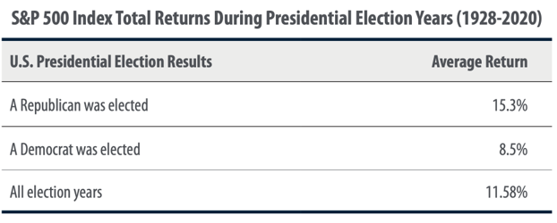 Digging deeper, there have been 24 elections since the S&P 500 began. Twenty of these years, the index ended up (83% of the time). When a Democrat was in office and elected (or reelected), the total return for the year averaged 15.0%. When a Republican was elected, the total return for the year averaged 12.9%.