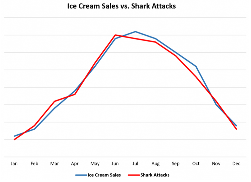 But let’s take a step back and dissect how correlation does not equal causation. Let’s look at a wild example of shark attacks vs ice cream sales: