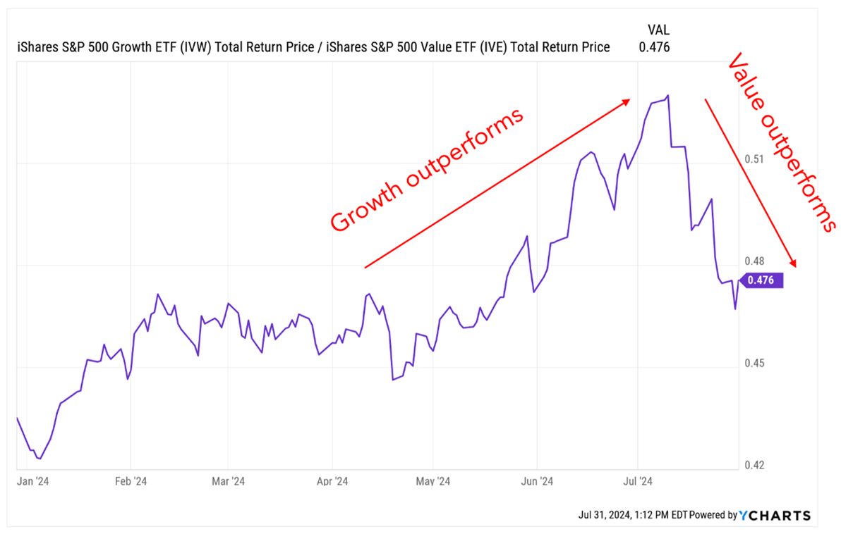 The chart below divides the year-to-date performance of growth stocks by that of value stocks. When the line rises, growth stocks outperform. When it falls, value stocks outperform. Growth stocks were winning big for most of the year, but this trend reversed sharply last month.