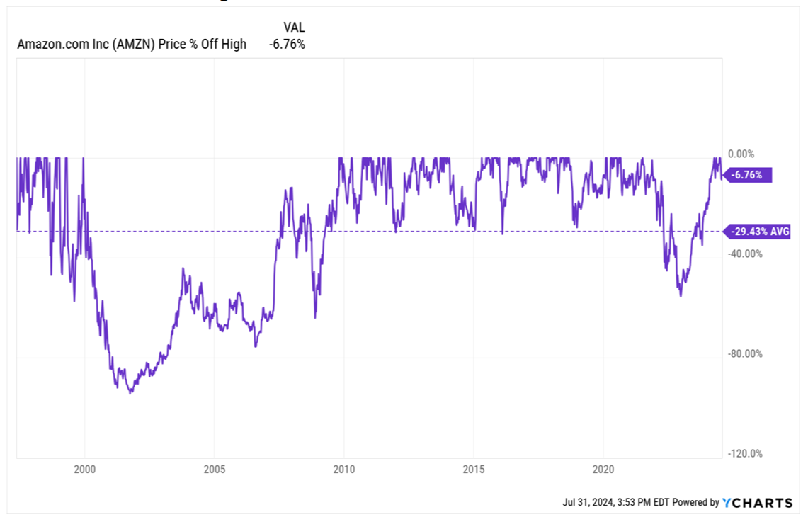 The chart below shows that even Amazon hasn’t been immune to volatility. It fell over 90% in the early 2000s and took eight years to recover (only to get whacked by over 60% months later). The dotted line also shows that long-term investors have endured regular drawdowns that averaged over 29%. This type of volatility will test the resolve of even the most devout believer.