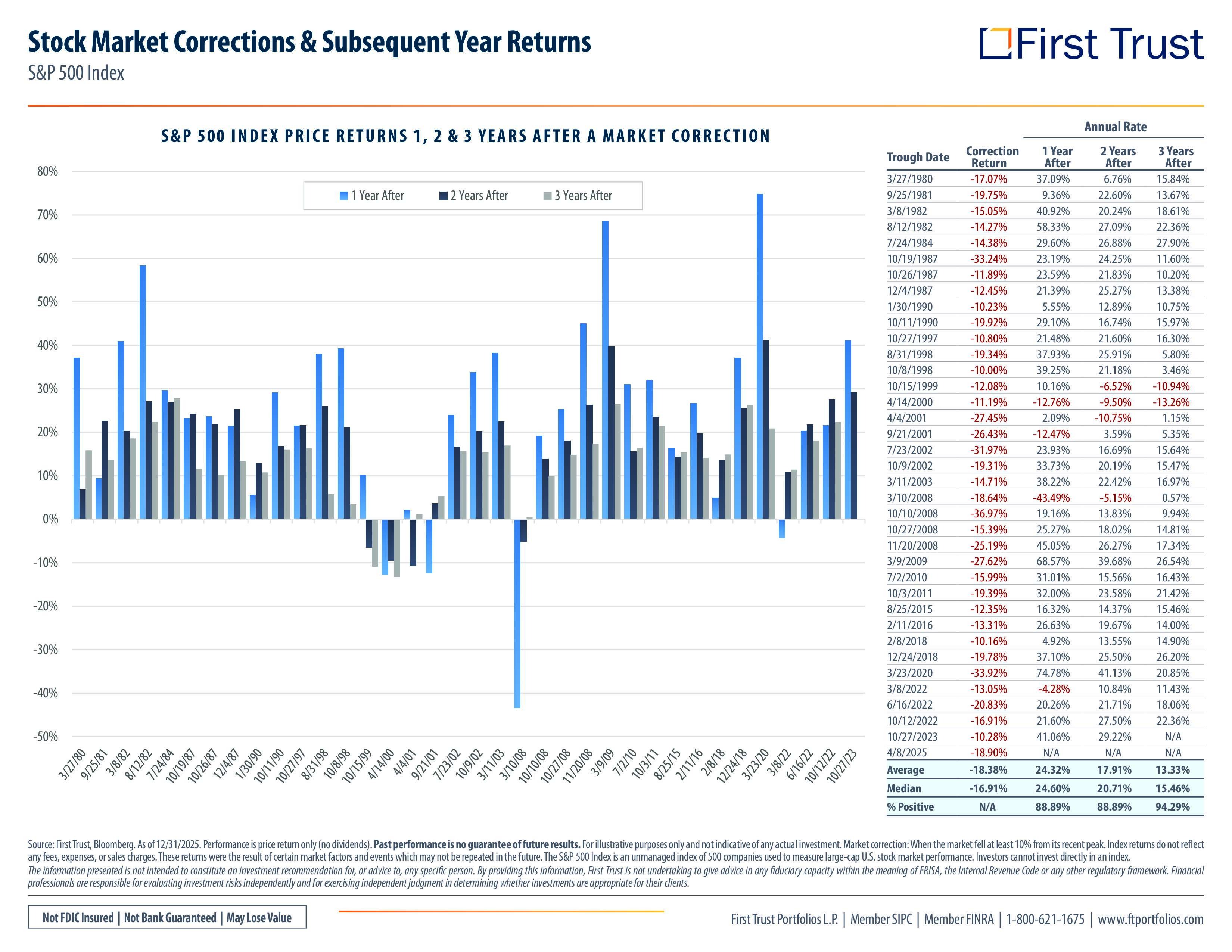 Corrections tell the same story. Looking at every market pullback of at least 10% going back to 1980, the average drawdown was roughly 18%. In the year that followed, markets were higher nearly 89% of the time, with an average gain of over 24%. Three years out, that positive rate climbed to 94%. Investors who stepped away during those moments of fear missed most of the recovery.