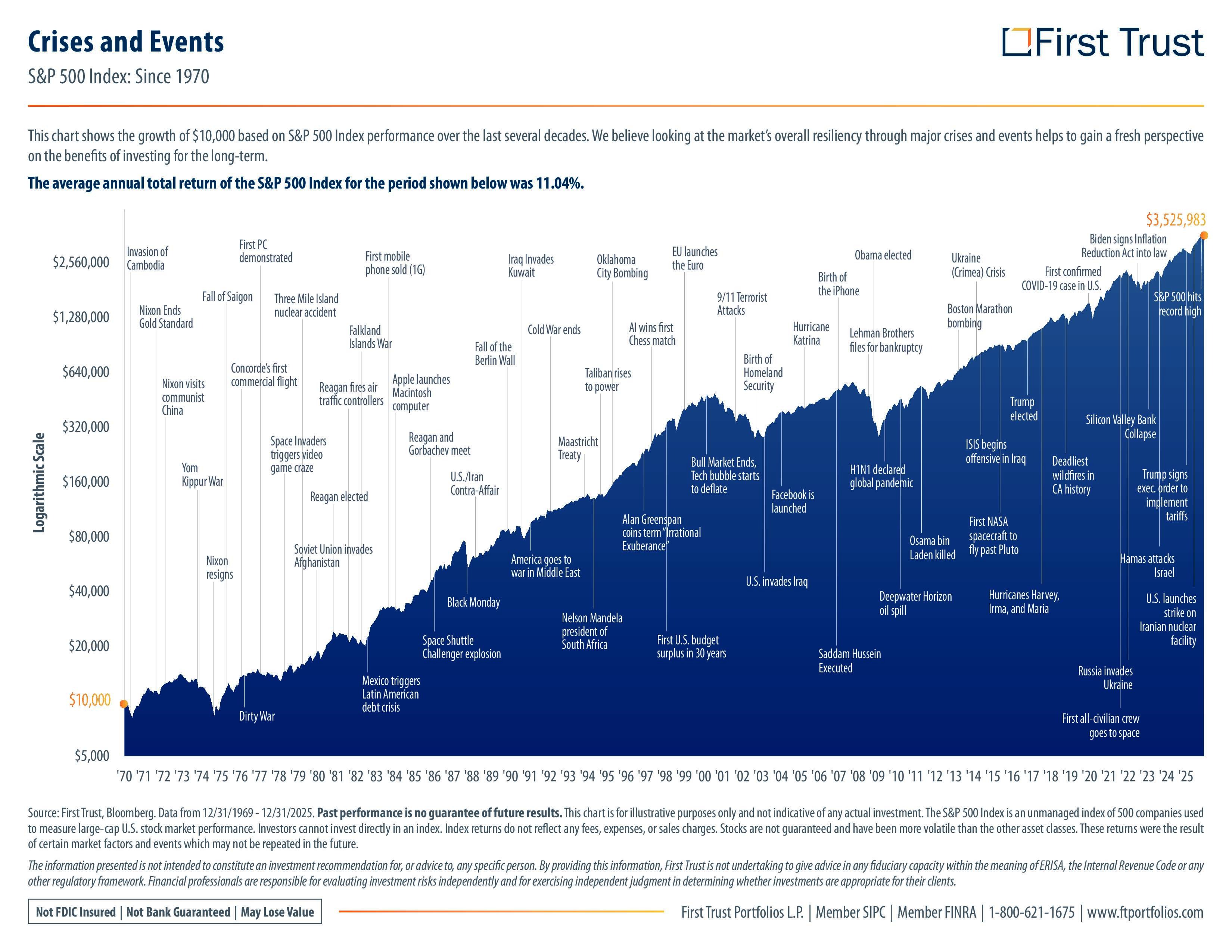 The $10,000 invested in the S&P 500 at the start of 1970 — through stagflation, Black Monday, the dot-com bust, the financial crisis, a global pandemic, and dozens of geopolitical crises — grew to over $3.5 million by the end of 2025. The plan you have in place was built with moments exactly like this one in mind.