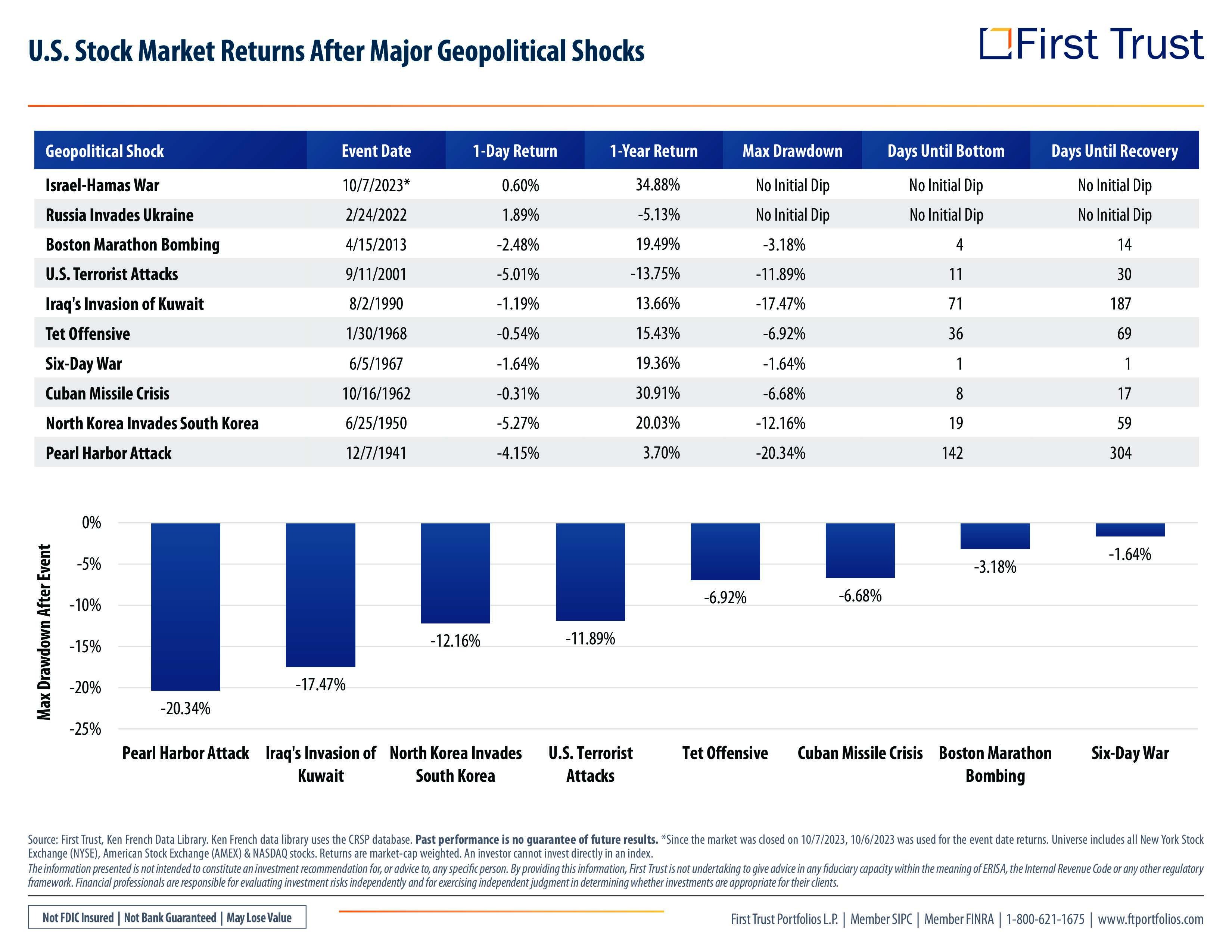 When a geopolitical shock hits, markets tend to flinch. Pearl Harbor sent stocks down 20.34% before they recovered. The 9/11 attacks caused an 11.89% drawdown. Iraq's invasion of Kuwait — another Middle East conflict involving U.S. military force — produced a 17.47% decline. But in every one of those cases, markets recovered fully. The year following Kuwait, stocks were up 13.66%. After the Cuban Missile Crisis, the market gained nearly 31% in the twelve months that followed. When Russia invaded Ukraine in February 2022, stocks didn't even record an initial decline.