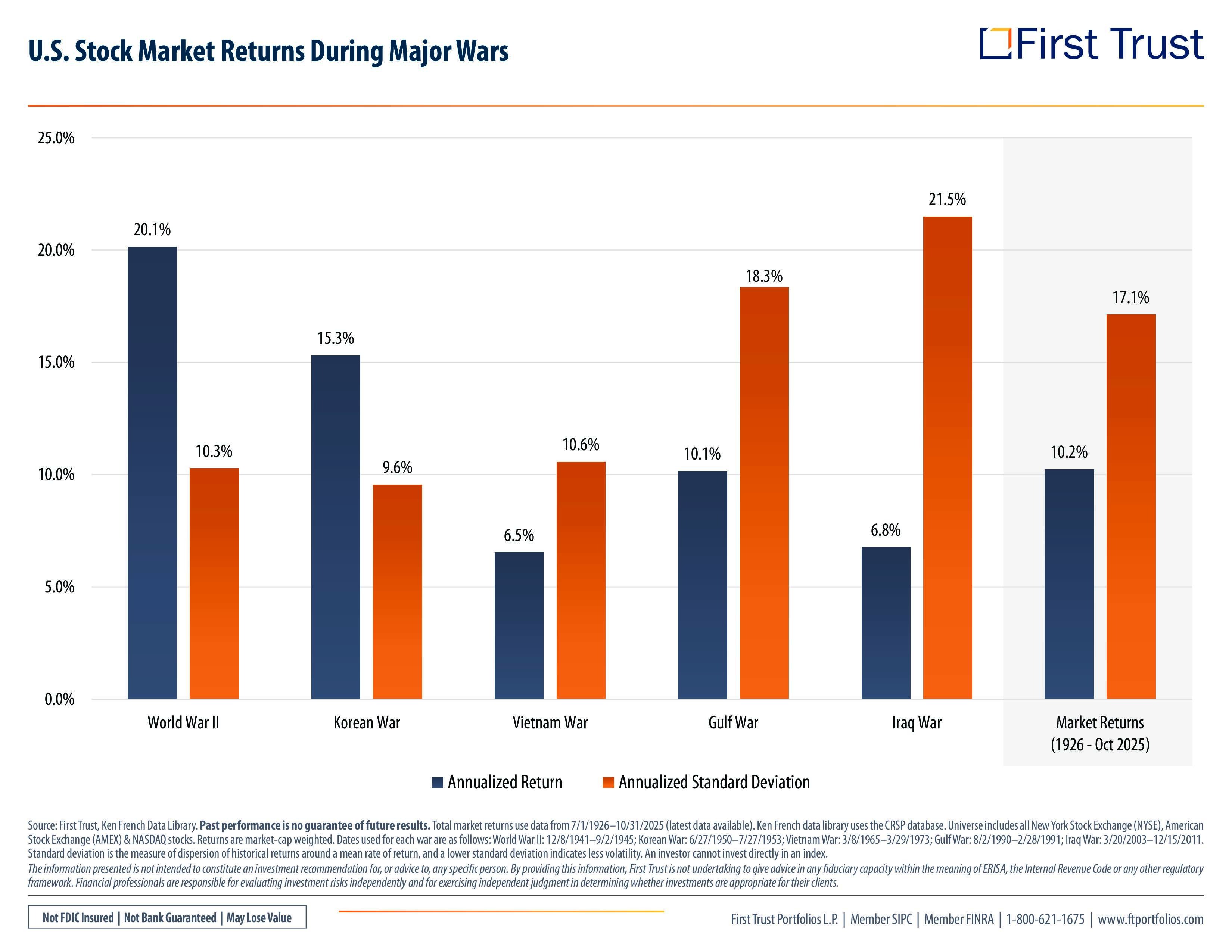 With US markets being the center of the investing world, it makes sense that it tends to react more when the US is involved. Still, the same resilience shows up even when you look at full-blown wars involving the US military. During World War II, the U.S. stock market posted an annualized return of 20.1%. During the Korean War, 15.3%. The Gulf War generated a 10.1% annualized return while fighting was actively underway. Markets are forward-looking by nature, and they have a long track record of moving through geopolitical uncertainty faster than the news cycle does.