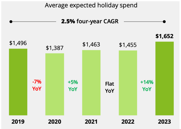 For the first time in two years, growth is coming from increased demand, not just higher prices2,6. The average consumer is expected to spend $1,652 on the holidays this year, a 14% increase from last year3.